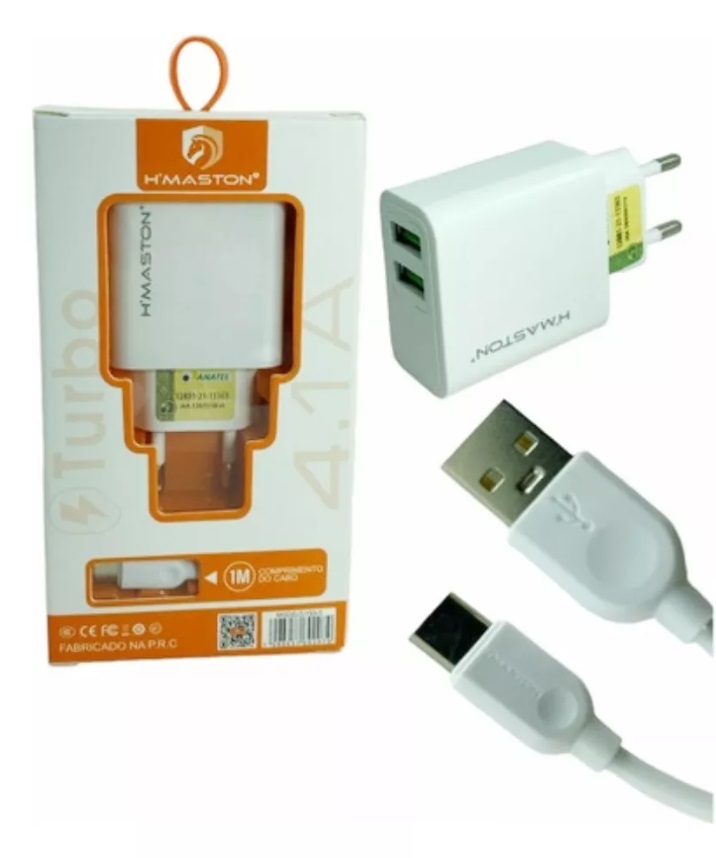 Um carregador de parede da H'maston versátil devido as suas 02 entradas USB, o que facilita seu manuseio.